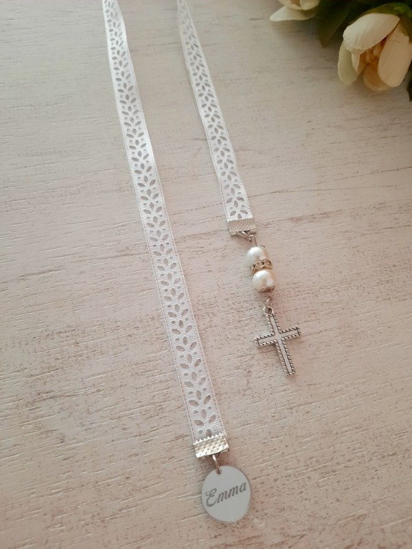 Señalador de libros con cinta espiga, perlas, nombre y dije a eleccion + bolsita de organza